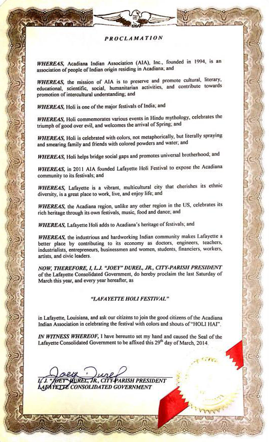 On March 29, 2014, Lafayette City-Parish President Joey Durel officially proclaimed the last Saturday of March to be celebrated as Lafayette Holi Festival.